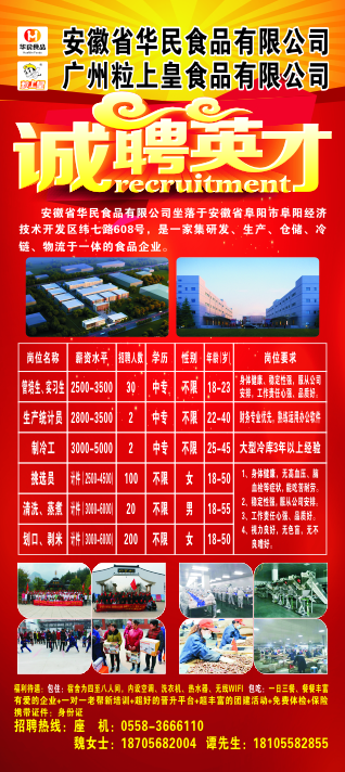高 薪 誠 聘 安徽省華民食品有限公司坐落于安徽省阜陽市阜陽經濟技術開發區緯七路608號,是一家集研發、生產、倉儲、冷鏈、物流于一體的食品企業。公司于2013年8月在阜陽市經濟技術開發區完成注冊,總占地面積73563平方米(約110.29畝)。安徽省華民食品有限公司生產研發基地項目,先后被列為2014年安徽省“861”工程,阜陽市重點招商農副產品加工項目,阜陽市“回鄉投資創業”重點企業。項目竣工投產后,成為具有生產加工、倉儲、冷鏈物流、辦公、宿舍、食堂等功能一體化的生產企業,開展板栗冷藏、挑選、篩選,干果挑選、篩選、炒制,冷庫租賃,貨物物流配送等業務,同時開展休閑食品的深加工、研發、電商等在全國范圍內具有領先水平的生產經營業務,成為具有現代化水平的食品生產企業。